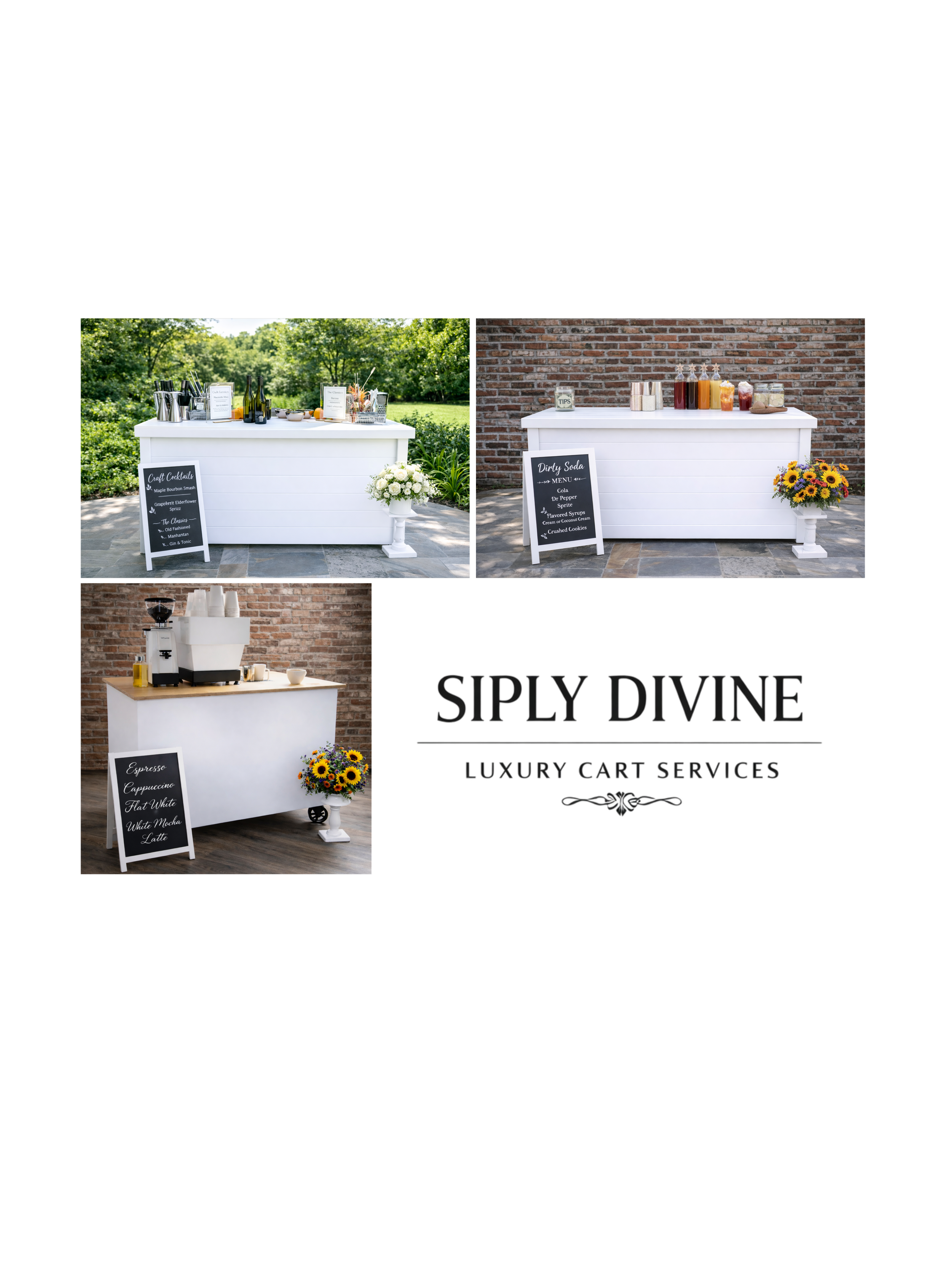 Siply Divine was created to bring a refined and memorable touch to every celebration through beautifully designed beverage cart experiences. Specializing in our mocktail cart, espresso cart, and dirty soda cart, we offer a unique blend of sophistication and creativity that elevates any event. Each menu is thoughtfully curated with exceptional flavor options and can be fully customized to reflect your vision, ensuring a personalized experience for you and your guests. From elegant weddings to special gatherings, we are dedicated to providing impeccable service and unforgettable moments with every sip.